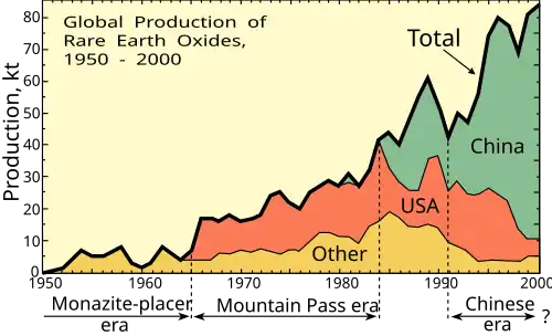 168. ^ a b Zhou, Baolu; Li, Zhongxue; Chen, Congcong (October 25, 2017). "Global Potential of Rare Earth Resources and Rare Earth Demand from Clean Technologies". Minerals. 7 (11): 203. Bibcode:2017Mine....7..203Z. doi:10.3390/min7110203. See production in Figure 1 on page 2