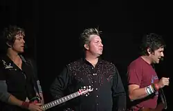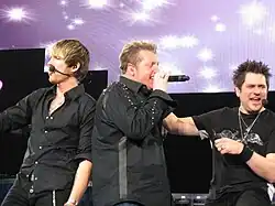 Rascal Flatts' music is defined primarily by country pop influences as well as their distinct vocal harmonies. Though the band is a vocal group, DeMarcus and Rooney have played bass and lead guitar on the majority of the band's studio albums. While the band's contemporaries, namely Tim McGraw and Kenny Chesney, originally incorporated a more neotraditional country approach to their sound, Rascal Flatts employed a crossover-friendly country pop sound as early as their debut album. This led to them often being derided as a country boy band, the genre's response to the wave of success seen by acts such as NSYNC and the Backstreet Boys.[52] Brian Mansfield of USA Today felt "Rascal Flatts—with clean-cut looks, showy vocals and pop-influenced arrangements—quickly found fans, as well as detractors willing to lump them with the boy-band knockoffs." DeMarcus recalled, "Randy Owen from Alabama grabbed me by the shoulders at the CMA Awards in New York. He said, 'I'm not going to BS you, buddy. Nobody likes you. Everybody hates you. You're just taking over the spot we were in 20 years ago.'"[53] Rooney recalled hearing the Dixie Chicks on the radio for the first time in 1997, saying, "I remember thinking, now here's a trio of girls who are incredible. They should come out with a trio of boys."[54]