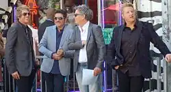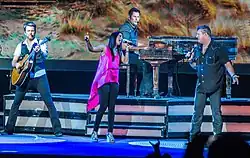 On April 8, 2013, Jay DeMarcus tweeted that Rascal Flatts was working on a new album[27] The lead single, "Rewind", was issued in January 2014[28] from the album of the same name, which was released on May 13, 2014.[29] The band admitted they were lip-syncing to a recording of "Rewind" during the Academy of Country Music (ACM) Awards on April 6, 2014. In response to the controversy, Rascal Flatts communicated afterwards that LeVox had lost his voice and so they made a last-minute decision to lip-sync.[30] "Rewind" became a Top 5 hit on the Country Airplay chart in 2014. Rewind produced three more singles with "Payback", which peaked at 21, "Riot", which reached 20, and "I Like the Sound of That", which was released to country radio on September 14, 2015. The latter song, co-written by Shay Mooney of Dan + Shay and pop musician Meghan Trainor, reached number 1 on the Country Airplay chart in April 2016. That year, Rascal Flatts were selected as one of 30 artists to perform on "Forever Country", a mash-up track of "Take Me Home, Country Roads", "On the Road Again" and "I Will Always Love You" which celebrates 50 years of the CMA Awards.[31] The band released a Christmas album entitled The Greatest Gift of All in October 2016.