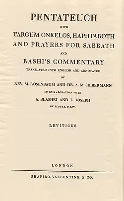 - Rosenbaum, Morris (1934). Pentateuch with Rashi's Commentary Translated into English "Silberman's Rashi".