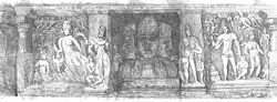 While some scholars have claimed the architecture at Elephanta is attributable to the Kalachuri, others claim that it was built during the Rashtrakuta period.[205] Some of the sculptures such as Nataraja and Sadashiva excel in beauty and craftsmanship even that of the Ellora sculptures.[206] Famous sculptures at Elephanta include Ardhanarishvara and Maheshamurthy. The latter, a three faced bust of Lord Shiva, is 25 feet (8 m) tall and considered one of the finest pieces of sculpture in India. It is said that, in the world of sculpture, few works of art depicting a divinity are as balanced.[207]