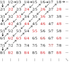 More precisely, one can sort the fractions by increasing values of the sum of the numerator and the denominator, and, for equal sums, by increasing numerator or denominator. This produces a sequence of fractions from which one can remove the reducible fractions (in red on the figure), obtaining a sequence that contains each rational number exactly once. This establishes a bijection between the rational numbers and the natural numbers, which maps each rational number to its rank in the sequence.