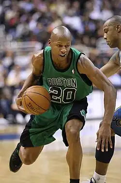 On June 28, 2007, the Sonics traded Allen and Glen Davis, the 35th overall pick in the 2007 NBA draft, to the Celtics in exchange for Delonte West, Wally Szczerbiak, and the fifth overall pick, Jeff Green. Shortly after acquiring Allen, the Celtics acquired Minnesota Timberwolves forward Kevin Garnett to play alongside Allen and Paul Pierce.[35] Upon joining the Celtics, Allen changed his jersey to number 20 because Paul Pierce already had number 34 in Boston.[36]