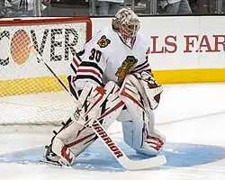 By the end of the lockout-shortened 2012–13 season, Emery and teammate Corey Crawford won the award for the NHL's best combined GAA, the 2013 William M. Jennings Trophy, awarded to the goaltender who gives up the fewest goals in the season and the Blackhawks were awarded the Presidents' Trophy as the regular season champions.[54] Emery finished the season with a 1.94 GAA, a .922 save percentage, and 17 wins with only one loss.[55] He won his first Stanley Cup when the Blackhawks defeated the Boston Bruins in the 2013 Stanley Cup Finals in six games.[56]