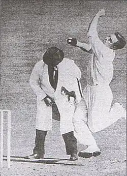 Lindwall, widely regarded as one of the greatest fast bowlers of all time, bowled with a classical and artistic side-on bowling action. David Frith wrote that "there was a balance, rhythmic run, a build-up" and an "ecstasy" in his smooth delivery action.[8] Richie Benaud said that Lindwall was "technically the best fast bowler" that he ever saw.[9] During the 1950s, Lindwall's action was copied by young children and a number of first-class Australian bowlers, including Ron Gaunt, John Power and Barry Fisher consciously copied his action.[8] Alan Davidson, who succeeded Lindwall as Australia's pace spearhead, labelled him as "the best fast bowler I ever saw".[106] Lindwall's childhood hero Harold Larwood rated Dennis Lillee to be equal to Lindwall "but not ahead of him".[106] Following Lindwall's tour of England in 1953, his English counterpart Alec Bedser said that Lindwall was "the best fast bowler I've seen, because of his variety and control".[106] Lindwall was particularly known for his trademark outswinger, which swung late and at high pace. Fred Trueman believed that Lindwall's ability to simultaneously swing the ball and at such pace and accuracy was matched only by himself and Wes Hall.[106] Frank Tyson wrote that "he appears to be just jogging his fifteen yards up to the stumps – until the last couple of strides of his approach, when he suddenly explodes into his delivery stride...when he releases the ball, his bowling arm is so low that it borders on the round-arm".[107] Lindwall's ability to swing the ball at high pace allowed him to repeatedly breach the defences of his opponents; of his 228 Test wickets, 98 were bowled and another 31 were leg before wicket.[11] Lindwall's repertoire was reinforced with a dangerous yorker and bouncer, and changes of pace.[106] As Tyson said "who is not 'Lindy's bunny' when he slots his yorker in the right spot?".[108] In 1952 he developed an inswinger and then coupled it with his yorker,[61] which homed into the feet of batsmen at high pace.[74] Denis Compton said that Lindwall had the subtleties of a slow bowler, saying that he "raised what is considered to be the labouring force of cricket [fast bowling] to an artform with his tactical shrewdness, control and variations".[74] Lindwall's emergence after the Second World War along with his new ball partner Keith Miller heralded a new era in cricket. The pair were regarded as the two best fast bowlers of their era, and signalled a change in the cricket landscape, which had been dominated during the interwar period by batsmen.[11] Together the pair formed a new ball fast-bowling combination regarded as one of the best in Test history.[8] During the 1948 tour of England, the hosts had agreed to have a new ball available every 55 overs, and the Australians used this to unleash Lindwall and Miller on the Englishmen with a shiny new ball. The pair often targeted the leading opposition batsmen, particular England's Len Hutton and Denis Compton with large amounts of short-pitched bowling, raising fast bowling to a new standard.[11][109] Hutton's battles with Lindwall were regarded as one of the key match-ups in Anglo-Australian battles of the time, and Hutton said his opponent had the ability to "strike at will".[106] Hutton felt that Lindwall's bouncers were the best that he faced, saying of their accuracy:"You had to play them or be hit".[11] Lindwall refused to bowl bouncers at tailenders, saying that "If the day ever came when I have to bowl bouncers at tailenders then I won't deserve to play for Australia".[110] When England developed quality pace bowlers of their own in the 1950s, Hutton was captain and he implemented a similar strategy to that executed by Lindwall and Miller.[11] In retirement, Lindwall went on to mentor Lillee,[11] who went on to break the Test world record for wicket-taking.[111]