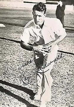 The Second Test in Bombay was the only time that Lindwall was to captain Australia in a Test match. Captain Johnson and his deputy Miller were both injured, leaving the bowling depleted. Ron Archer was injured and unavailable as Australia bowled first in extremely hot conditions.[87] The situation worsened throughout the match as pacemen Alan Davidson and Pat Crawford were hindered by stomach bugs and hip strains respectively during the game. Leg spinner Richie Benaud could not bowl for part of the match after being affected by a fever and left arm orthodox spinner John Wilson pulled a muscle midway through his debut.[87] This left Lindwall and batting all rounder Ken Mackay as the only fully fit bowling options. Australia bowled out India for 251, before a strong batting effort led by Neil Harvey and Jim Burke, both of whom made centuries, saw Australia make 7/523.[87] Lindwall contributed a hard-hitting unbeaten 48 at the end. Australia's depleted bowling told in the home side's second innings, as the visitors were only able to prise out five wickets and match ended in a draw, with Indian captain Polly Umrigar batting for six hours for a defiant 78.[86][88] Lindwall finished the tour with scores of eight and 28 in the Third Test in Madras.[23] In a low scoring match in which all four innings finished under 190,[89] Lindwall took match figures of 3/41 in a 94 run victory.[23] It was a successful series for Lindwall, taking 12 wickets at 16.58 and scoring 92 runs at 30.66.[89]