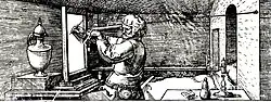 The idea of ray tracing comes from as early as the 16th century, when it was described by Albrecht Dürer, who is credited for its invention.[5] Dürer described multiple techniques for projecting 3-D scenes onto an image plane. Some of these project chosen geometry onto the image plane, as is done with rasterization today. Others determine what geometry is visible along a given ray, as is done with ray tracing.[6][7]