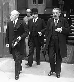 Poincaré became increasingly sidelined after the accession to power of Georges Clemenceau as prime minister in 1917. He believed the Armistice happened too soon and that the French Army should have penetrated far deeper into Germany.[30] At the Paris Peace Conference of 1919, negotiating the Treaty of Versailles, he wanted France to wrest the Rhineland from Germany to put it under Allied military control.[31][32]