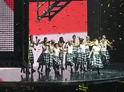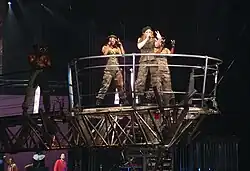 The wardrobe for the Re-Invention tour was overseen by designer Arianne Phillips, who stated that the costume design followed the same approach as the tour itself —reworking past material with new presentation.[42] Madonna underwent five costume changes during the concert, with contributions from designers Stella McCartney, Christian Lacroix, and Karl Lagerfeld for Chanel.[43] Each act featured a distinct visual style. Lacroix, who had previously collaborated with the singer on X-STaTIC PRO=CeSS, recreated one of the corsets from that project for the tour's opening: a champagne-colored, crystal-studded piece with Baroque inspiration.[42][44] The second segment, tied to the American Life album, included military-inspired outfits described by Phillips as "real rock 'n' roll".[42][44] The third act, influenced by the work of Federico Fellini and traditional circus aesthetics, featured bold chorus girl corsets by Lagerfeld.[44][45] For the more subdued fourth act, McCartney designed minimal garments that emphasized performer silhouettes.[44] The final segment incorporated kilts from USA Kilts, blending traditional Scottish elements with contemporary streetwear touches.[46][44] Additional wardrobe pieces included T-shirts by Jean Paul Gaultier and shoes by Miu Miu.[44] The official tour poster featured an image from X-STaTIC PRO=CeSS, showing Madonna in a 17th-century-style dress, crawling toward the camera.[4]