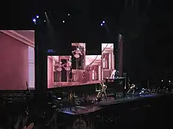 The production, estimated at $1 million, featured an ambitious stage design. It included a 13 m (43 ft) rotating turntable that could rise nearly 3 m (9.8 ft) and spin at speeds up to 6.7 m/s (15 mph), along with a conveyor belt that ran along the front edge of the stage.[35][36] Five massive video screens—one weighing seven tons—formed the multimedia backdrop, moved by 160 individual motors.[37] Additional elements included 130 rigging points, an elaborate lighting system, and a four-ton Claire Brothers line array sound system. A 22 metres (72 ft) V-shaped catwalk was suspended from the ceiling, descending over the crowd during certain numbers.[38][39][40][37] The show also used striking visual props such as a skateboarding half-pipe and an electric chair, with footage from the X-STaTIC PRO=CeSS installation featured throughout.[41] Notably, there was no opening act.[21]