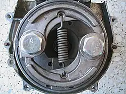 Another example of a rotating device in which a reactive centrifugal force can be identified used to describe the system behavior is the centrifugal clutch. A centrifugal clutch is used in small engine-powered devices such as chain saws, go-karts and model helicopters. It allows the engine to start and idle without driving the device, but automatically and smoothly engages the drive as the engine speed rises. A spring is used to constrain the spinning clutch shoes. At low speeds, the spring provides the centripetal force to the shoes, which move to larger radius as the speed increases and the spring stretches under tension. At higher speeds, when the shoes can't move any further out to increase the spring tension, due to the outer drum, the drum provides some of the centripetal force that keeps the shoes moving in a circular path. The force of tension applied to the spring, and the outward force applied to the drum by the spinning shoes are the corresponding reactive centrifugal forces. The mutual force between the drum and the shoes provides the friction needed to engage the output drive shaft that is connected to the drum.[8] Thus the centrifugal clutch illustrates both the fictitious centrifugal force and the reactive centrifugal force.