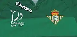 Real Betis originally played in all blue jerseys and white shorts, for no other reason than the easy availability of such plain colours. However, one of the club's founders and team captain, Manuel Ramos Asensio, was keen to take advantage of his relationships made while studying in Scotland, contacted Celtic (whose green and white colours matched the Andalusian regional flag) and obtained the same fabric to make kits for his own club. Ramos had the lines re-orientated from horizontal 'hoops' into vertical stripes to make the shirts (no other Spanish club used the combination at the time). There is no mention of Celtic or Scotland in the history of Betis on the club's official website,[6] but in 2017 the club officially acknowledged the link by producing a special hooped kit to coincide with Andalusia Day.[7] The blue colour is still often used in away kit designs.[8]