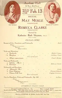 Clarke was sought after as a violist, and was invited to the at-home chamber music recitals of Paul and Muriel Draper in Lisson Grove from 1911 to 1914;[20][21][22] Paul Draper was an American tenor studying in London with Raimund von zur-Mühlen.[23] Clarke played with Artur Schnabel, Pablo Casals, Jascha Heifetz, Jacques Thibaud, Guilhermina Suggia, Arthur Rubinstein, Pierre Monteux, and George Szell, among others.[6]