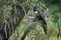 - C. b. graptogyne, (Endangered)[22] known as the south-eastern red-tailed black cockatoo, is found in southwestern Victoria and southeastern South Australia in an area bordered by Mount Gambier to the west, Portland to the south, Horsham to the northeast and Bordertown to the north.[23] The smallest of the five subspecies,[21] it was only recognised as distinct in the 1980s.[24][25] It is predominantly dependent on stands of Eucalyptus baxteri (brown stringybark), Eucalyptus camaldulensis (river redgum) and Allocasuarina luehmannii (buloke) for feeding and nesting.[26] These tree species have been all threatened by land clearing and most remaining are on private land; possibly only 500–1000 individuals remain.[27] The subspecies and its habitat are the subject of a national recovery plan.[28] In 2007 local landowners are being reimbursed for assisting in regenerating suitable habitat.[29]