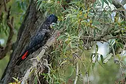 The red-tailed black cockatoo (Calyptorhynchus banksii) also known as Banksian- or Banks' black cockatoo, is a large black cockatoo native to Australia. Adult males have a characteristic pair of bright red panels on the tail that gives the species its name. It is more common in the drier parts of the continent. Five subspecies are recognised, differing chiefly in beak size. Although the more northerly subspecies are widespread, the two southern subspecies, the forest red-tailed black cockatoo and the south-eastern red-tailed black cockatoo are under threat.