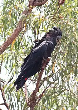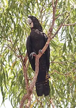 In 1827, Jennings proposed the name Psittacus niger for the bird.[10] The binomial combination had already been used by Carl Linnaeus for the lesser vasa parrot in 1758,[11] and by Johann Friedrich Gmelin for the palm cockatoo in 1788; it was thus invalid even though both other species were already known by different names at the time. Alternate common names include Banks' black cockatoo, Banksian black cockatoo, or simply black cockatoo.[2]: 89 Indigenous people of the central Cape York Peninsula have several names for the bird: (minha) pachang in Pakanh; (inh -) inhulg in Uw Oykangand; and (inh -) anhulg in Uw Olkola. (The bracketed prefix (inh- or minha) is a qualifier meaning 'meat' or 'animal'.)[12] Ngarnarrh or karnamarr are terms used by the Kunwinjku of Arnhem Land.[13][14] In Central Australia, southwest of Alice Springs, the Pitjantjatjara term for the subspecies C. b. samueli is iranti.[15] Karrak is a Noongar term derived from the call for the southwestern race C. b. naso.[16] In the language of the Bungandidj of south-eastern South Australia and western Victoria this bird was called treen.[17]