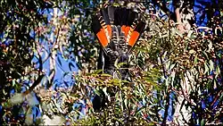 - C. b. naso (Vulnerable)[31] is known as the forest red-tailed black cockatoo and is found in the southwest corner of Western Australia between Perth and Albany. This form has a larger bill,[32] and favours marri (Corymbia (formerly Eucalyptus) calophylla), jarrah (E. marginata) and karri (E. diversicolor).[33] Two of the most significant threats to this subspecies are illegal shooting and feral honeybees.[34]
