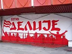 Hardcore supporters began to emerge during the 1980s, with official inauguration taking place in 1989. Previously, Red Star fans were scattered amongst several organized fan groups within the north terrace of the Rajko Mitić Stadium, colloquially known as "Marakana". Their style of support is greatly influenced by Italian and English football culture of the 1980s. It includes the use of widespread choreography, flares, flags, banners, and boisterous cheering.[39] The word Delije is displayed (in Cyrillic) on the north terrace seats of Rajko Mitić Stadium as a sign of appreciation, and fidelity between the club and supporters. Subgroups of Delije exist outside of Belgrade, along with cities across Serbia and all other ex-Yugoslav republics. Despite Red Star's broad fan base, Delije have developed an infamous reputation for hooliganism amongst some segments of its ultras, especially during Belgrade derbies.[40][41]