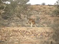 The red kangaroo ranges throughout western and central Australia. Its range encompasses scrubland, grassland, and desert habitats. It typically inhabits open habitats with some trees for shade.[21] Red kangaroos are capable of conserving enough water and selecting enough fresh vegetation to survive in an arid environment. The kangaroo's kidneys efficiently concentrate urine, particularly during summer.[22] Red kangaroo primarily eat green vegetation, particularly fresh grasses, forbs and other dicotyledonous flowering plants, and can get enough even when most plants look brown and dry.[23][24]