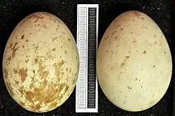 Usually red kites first breed when they are two years old, although exceptionally they can successfully breed when they are only one year old.[19][20][21] They are monogamous and the pair-bond in resident populations is probably maintained during the winter, particularly when the pair remain on their breeding territory. For migrant populations the fidelity to a particular nesting site means that the pair-bond is likely to be renewed each breeding season.[22] The nest is normally placed in a fork of a large hardwood tree at a height of between 12 and 15 m (39 and 49 ft) above the ground. A pair will sometimes use a nest from the previous year and can occasionally occupy an old nest of the common buzzard.[23] The nest is built by both sexes. The male brings dead twigs 30–50 cm (12–20 in) in length which are placed by the female. The nest is lined with grass and sometimes also with sheep's wool. Unlike the black kite, no greenery is added to the nest. Both sexes continue to add material to the nest during the incubation and nestling periods. Nests vary greatly in size and can become large when the same nest is occupied for several seasons.[19]