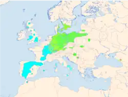 Red kites inhabit broadleaf woodlands, pastures, mixed farmland, valleys and wetland edges, up to at least 1,600 metres (5,200 ft) elevation.[2] They are native to the western Palearctic, with all of the currently known 32,200–37,700 breeding pairs being in Europe.[2] There also used to be breeding populations in western Asia (northern Iran, Syria and Turkey) and northwestern Africa (Algeria, Morocco and Tunisia), but most of these were extirpated in the 19th century or earlier;[39] the only non-European breeding population in recent decades was in Morocco where the last known pair was in 2004.[2] Today it breeds from Portugal and Spain, through the central part of the continent east to European Russia, north to southern Scandinavia, Latvia and the United Kingdom, and south to southern Italy; few if any breeders remain in the Balkans.[2][39] Most red kites that breed in the northern European mainland used to move south or west in winter, typically wintering in Spain and other parts of western Europe with a mild climate, as well as northwestern Africa (Algeria, Morocco and Tunisia) and Turkey. In recent decades, an increasing number of red kites from the northern European mainland have stayed in the region year-round.[2]