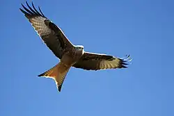 The red kite (Milvus milvus) is a bird of prey in the family Accipitridae, which also includes many other diurnal raptors such as eagles, buzzards, and harriers. The species currently breeds only in Europe, though it formerly also bred in west Asia and northwest Africa.[2][4] Historically, it was only resident in the milder parts of its range in western Europe and northwestern Africa, whereas all or most red kites in northern mainland Europe wintered to the south and west, some also reaching western Asia, but an increasing number of northern birds now remain in that region year-round.[2] Vagrants have reached north to Finland and south to Israel, Libya and the Gambia.[4][5]