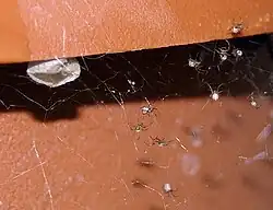 Redback spiderlings cohabit on the maternal web for several days to a week, during which time sibling cannibalism is often observed.[41] They then leave by being carried on the wind. They follow light and climb to the top of nearby logs or rocks before extending their abdomens high in the air and producing a droplet of silk.[35] The liquid silk is drawn out into a long gossamer thread that, when long enough, carries the spider away. This behaviour is known as ballooning or kiting. Eventually, the silken thread will adhere to an object where the young spider will establish its own web.[22] They sometimes work cooperatively, climbing, releasing silk and being carried off in clusters.[35] Juvenile spiders build webs,[30] sometimes with other spiders.[35]