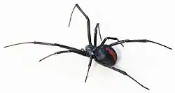 The adult female redback has a body around 1 centimetre (0.4 in) long, with slender legs, the first pair of which are longer than the rest.[21] The round abdomen is a deep black (occasionally brownish), with a red (sometimes orange) longitudinal stripe on the upper surface and an hourglass-shaped scarlet streak on the underside.[22] Females with incomplete markings or all-black abdomens occasionally occur.[23] The cephalothorax is much smaller than the abdomen, and is black.[21] Redback spiderlings are grey with dark spots,[7] and become darker with each moult.[24] Juvenile females have additional white markings on the abdomen.[22] The bright scarlet red colours may serve as a warning to potential predators.[25] Each spider has a pair of venom glands, one attached to each of its chelicerae[26] with very small fangs.[27] Small compared to the female,[28] the male redback is 3–4 mm (0.12–0.16 in) long and is light brown, with white markings on the upper side of the abdomen and a pale hourglass marking on the underside.[22]