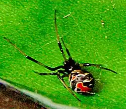 A member of the genus Latrodectus in the family Theridiidae, the redback belongs in a clade with the black widow spider,[10] with the katipō as its closest relative.[18] A 2004 molecular study supports the redback's status as a distinct species, as does the unique abdomen-presenting behaviour of the male during mating.[10] The close relationship between the two species is shown when mating: the male redback is able to successfully mate with a female katipō producing hybrid offspring. However, the male katipō is too heavy to mate with the female redback, as it triggers a predatory response in the female when it approaches the web, causing the female to eat it.[19] There is evidence of interbreeding between female katipō and male redbacks in the wild.[18][20]