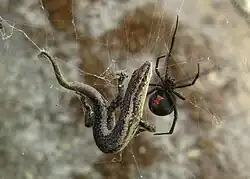 Mainly nocturnal, the female redback lives in an untidy web in a warm sheltered location, commonly near or inside human residences. It preys on insects, spiders and small vertebrates that become ensnared in its web. It kills its prey by injecting a complex venom through its two fangs when it bites, before wrapping them in silk and sucking out the liquefied insides. Often, it first squirts its victim with what resembles 'superglue' from its spinnerets, immobilising the prey by sticking the victim's limbs and appendages to its own body. The redback spider then trusses the victim with silk. Once its prey is restrained, it is bitten repeatedly on the head, body and leg segments and is then hauled back to the redback spider's retreat. Sometimes a potentially dangerous victim can be left to struggle for hours until it is exhausted enough to approach safely.[5] Male spiders and spiderlings often live on the periphery of the female spiders' web and steal leftovers. Other species of spider and parasitoid wasps prey on this species. The redback is one of a number of arachnids that usually display sexual cannibalism while mating.