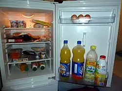 In the late 19th Century and into the very early 20th Century, except for staple foods (sugar, rice, and beans) that needed no refrigeration, the available foods were affected heavily by the seasons and what could be grown locally.[54][55] Refrigeration has removed these limitations. Refrigeration played a large part in the feasibility and then popularity of the modern supermarket. Fruits and vegetables out of season, or grown in distant locations, are now available at relatively low prices. Refrigerators have led to a huge increase in meat and dairy products as a portion of overall supermarket sales.[56] As well as changing the goods purchased at the market, the ability to store these foods for extended periods of time has led to an increase in leisure time. Prior to the advent of the household refrigerator, people would have to shop on a daily basis for the supplies needed for their meals.[57][58]