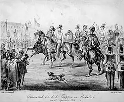 The Russian military presence on the Principalities' soil was inaugurated in the first days of the war: by late April 1828, the Russian army of Peter Wittgenstein had reached the Danube (in May, it entered present-day Bulgaria).[26] The campaign, prolonged for the following year and coinciding with devastating bubonic plague and cholera epidemics (which together killed around 1.6% of the population in both countries),[29] soon became a drain on local economy:[30] according to British observers, the Wallachian state was required to indebt itself to European creditors for a total sum of ten million piastres, in order to provide for the Russian army's needs.[31] Accusations of widespread plunder were made by the French author Marc Girardin, who travelled in the region during the 1830s; Girardin alleged that Russian troops had confiscated virtually all cattle for their needs, and that Russian officers had insulted the political class by publicly stating that, in case the supply in oxen was to prove insufficient, boyars were to be tied to carts in their place—an accusation backed by Ion Ghica in his recollections.[32][33] He also recorded a mounting dissatisfaction with the new rule, mentioning that peasants were especially upset by the continuous maneuvers of troops inside the Principalities' borders.[34] Overall, Russophilia in the two Principalities appears to have suffered a major blow.[35] Despite the confiscations, statistics of the time indicated that the pace of growth in heads of cattle remained steady (a 50% growth appears to have occurred between 1831 and 1837).[36]