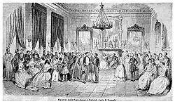 In 1829, two drafting commissions were formed, a Moldavian and a Wallachian one, which began working on Regulamentul Organic in Bucharest. Their work was finished on 11 April 1830 (March 30, OS) when the final text of the project was written. The documents were then sent to Saint Petersburg by a delegation consisting of Alexandru Vilara, Mihail Sturdza, Gheorghe Asachi, as well as two Russian officials, under the leadership of State Secretary Daschkoff.[41][42] Regulamentul Organic was adopted in its two very similar versions[43] on 13 July 1831 (July 1, OS) in Wallachia and 13 January 1832 (1 January, OS) in Moldavia, after having minor changes applied to it in Saint Petersburg where it was assessed further. Its ratification by Sultan Mahmud II was not a requirement from Kiselyov's perspective, who began enforcing it as a fait accompli before this was granted.[44] The final version of the document sanctioned the first local government abiding by the principles of separation and balance of powers. The hospodars, elected for life (and not for the seven-year term agreed in the Convention of Akkerman) by an Extraordinary Assembly which comprised representatives of merchants and guilds, stood for the executive, with the right to nominate ministers (whose offices were still referred to using the traditional titles of courtiers) and public officials;[35] hospodars were to be voted in office by an electoral college with a confirmed majority of high-ranking boyars (in Wallachia, only 70 persons were members of the college).[45]