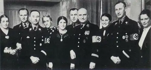 Although the starting monthly salary of 180 Reichsmarks (equivalent to €679 in 2021) was low, Heydrich decided to take the job because Lina's family supported the Nazi movement, and the quasi-military and revolutionary nature of the post appealed to him.[40] At first he had to share an office and typewriter with a colleague, but by 1932 Heydrich was earning 290 Reichsmarks a month (equivalent to €1,191 in 2021), a salary he described as "comfortable".[41] As his power and influence grew throughout the 1930s, his wealth grew commensurately; in 1935 he received a base salary of 8,400 Reichsmarks (equivalent to €38,766 in 2021) and an allowance of 12,000 Reichsmarks (equivalent to €55,379 in 2021) and by 1938 his income increased to 17,371 Reichsmarks (equivalent to €77,580 in 2021), annually.[42] Heydrich later received a Totenkopfring from Himmler for his SS service.[43]