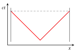 In the first diagram, the two ends of the train are drawn as grey lines. Because the ends of the train are stationary with respect to the observer on the train, these lines are just vertical lines, showing their motion through time but not space. The flash of light is shown as the 45° red lines. The points at which the two light flashes hit the ends of the train are at the same level in the diagram. This means that the events are simultaneous.