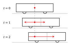 Einstein's version of the experiment[15] presumed that one observer was sitting midway inside a speeding traincar and another was standing on a platform as the train moved past. As measured by the standing observer, the train is struck by two bolts of lightning simultaneously, but at different positions along the axis of train movement (back and front of the train car). In the inertial frame of the standing observer, there are three events which are spatially dislocated, but simultaneous: standing observer facing the moving observer (i.e., the center of the train), lightning striking the front of the train car, and lightning striking the back of the car.