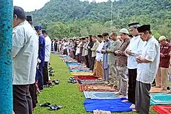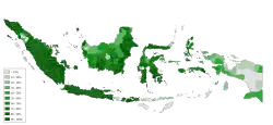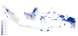 From 1965 to 2017, Indonesian law mandated that its citizens possess an identity card indicating their religious affiliation, which could be chosen from a selection of those six recognised religions.[15] However, since 2017, citizens who do not identify with those religions have the option to leave that section blank on their identity card.[7] Although there is no apostasy law preventing Indonesians from converting to any religion, Indonesia does not recognise agnosticism or atheism, and blasphemy is considered illegal.[16] According to Ministry of Home Affairs data in 2024, 87.09% of Indonesians identified themselves as Muslim (with Sunnis about 99%,[17] Shias about 1%[18]), 10.45% Christians (7.38% Protestants, 3.07% Roman Catholic), 1.67% Hindu, 0.71% Buddhists, 0.03% Confucians, 0.04% Folk and others.[1]
