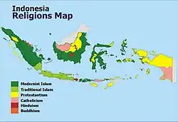 The religions professed by citizens in Indonesia are: Islam, Christianity [Catholicism and Protestantism], Hinduism, Buddhism, and Kong Fuzi (Confucianism).