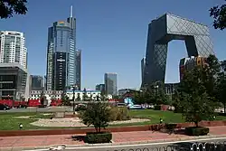 In his design for the new CCTV Headquarters in Beijing (2009), Koolhaas did not opt for the stereotypical skyscraper, often used to symbolize and landmark such government enterprises; he patented a "horizontal skyscraper" in the U.S. The building, popularly called "The Big Pants" by Beijing residents, was designed as a series of volumes which attempt to tie together the numerous departments onto the nebulous site, but also introduce routes (again, the concept of cross-programming) for the general public through the site, allowing them some degree of access to the production procedure. An unfortunate incident that highlighted the folly of the circulation scheme (no effective fire egress for people on the upper floors), was the construction fire that nearly destroyed the building and a nearby hotel in 2009.[28] In discussions of his design, Koolhaas has expressed his optimism for socialist development in China and critiqued the capitalist system for leading to architectural failure through its decentralizing of large organizations and discouragement of communication.[29]: 78–79