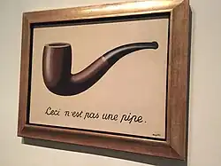 Magritte's work frequently displays a collection of ordinary objects in an unusual context, giving new meanings to familiar things. The use of objects as other than what they seem typifies his work[32] The Treachery of Images (La trahison des images), which shows a pipe that looks as though it is a model for a tobacco store advertisement. Magritte painted below the pipe "Ceci n'est pas une pipe" ("This is not a pipe"),[33] which seems a contradiction but is actually true: the painting is not a pipe, it is an image of a pipe. It does not "satisfy emotionally"; asked about this image, Magritte said that of course it was not a pipe—just try to fill it with tobacco.[34]
