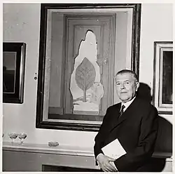 Portrait of Magritte in front of his painting La perspective amoureuse, 1961