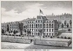 In 1847 alumnus Benjamin Franklin Greene became the new senior professor. Earlier he had done a thorough study of European technical schools to see how Rensselaer could be improved. In 1850 he reorganized the school into a three-year polytechnic institute with six technical schools.[16] In 1861 the name was changed to Rensselaer Polytechnic Institute.[17] A severe conflagration of 10 May 1862, known as "The Great Fire", destroyed more than 507 buildings in Troy and gutted 75 acres (300,000 m2) in the heart of the city.[18][19] The "Infant School" building that housed the institute at the time was destroyed in this fire. Columbia University proposed that Rensselaer leave Troy altogether and merge with its New York City campus. Ultimately, the proposal was rejected, and the campus left the crowded downtown for the hillside. Classes were temporarily held at the Vail House and in the Troy University building until 1864,[20] when the institute moved to a building on Broadway on 8th Street, now the site of the Approach.[19]