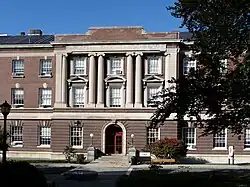 President Palmer Ricketts supervised the construction of the school's "Green Rooftop" Colonial Revival buildings that give much of the campus a distinct architectural style. Buildings constructed during this period include the Carnegie Building (1906), Walker Laboratory (1907), Russell Sage Laboratory (1909),[42] Pittsburgh Building (1912), Quadrangle Dormitories (1916–1927), Troy Building (1925), Amos Eaton Hall (1928), Greene Building (1931) and Ricketts Building (1935). Also built during this period was "The Approach" (1907), a massive ornate granite staircase found on the west end of campus. Originally linking RPI to the Troy Union Railroad station, it again serves as an important link between the city and the university.[43] In 1906 the '86 Field, home field of the football team until 2008, was completed with support of the Class of 1886.