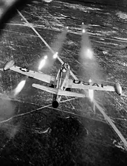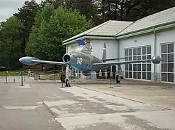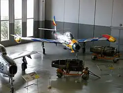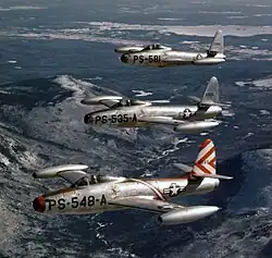 The Thunderjet had a distinguished record during the Korean War.[30] After the entry of the People's Republic of China into the war in October 1950, the US Fifth Air Force requested that a wing of F-84s be sent to Korea.[40] While the F-84B and F-84C could not be deployed overseas because their J35 engines had a service life of only 40 hours, the F-84D and F-84E were more suitable,[41] and so the F-84E-equipped 27th Fighter Escort Group was sent to the Far East aboard the aircraft carrier Bataan, which arrived in Japan on 30 November 1950. After maintenance, the F-84s moved to Taegu airfield (known as K-2), flying its first operational missions on 7 December 1950.[40] The aircraft were initially tasked with escorting the B-29 Superfortress bombers. The first Thunderjet air-to-air victory was scored on 21 January 1951 at the cost of two F-84s.[39][42] The F-84 was outmatched by the swept-wing Soviet Mikoyan-Gurevich MiG-15, which was both faster and more manoeuvrable,[36] and the MiG counter-air mission was soon given to the F-86 Sabre. The F-84 switched to the ground attack role at which it excelled.[43]