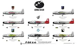 - The F-84 was the first aircraft flown by the U.S. Air Force Thunderbirds, which operated F-84G Thunderjets from 1953 to 1955 and F-84F Thunderstreaks from 1955 to 1956.[31] The F-84E was also flown by the Skyblazers team of United States Air Forces Europe (USAFE).[62]