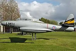 The final straight-wing F-84 was the F-84G, intended as a stop-gap until the swept wing F-84F entered service, but ordered in large numbers to build-up NATO air forces.[22] It introduced a refueling boom receptacle in the left wing,[27][28][29] autopilot, Instrument Landing System, J35-A-29 engine with 5,560 lbf (24.73 kN) of thrust, a distinctive framed canopy (also retrofitted to earlier types), and the ability to carry a single Mark 7 nuclear bomb.[27][28] The F-84G entered service in 1951, although deliveries were slowed by shortages of engines. Production continued until July 1953 with 3,025 F-84Gs delivered, with 789 going to the USAF and 2,236 to US allies as part of US military aid.[30] The F-84G was retired from the USAF in mid-1960.[31]