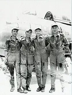 On 21 July 1956, four ROCAF F-84G aircraft from the 4th Squadron, based at Chiayi Air Base, undertook an escort mission over the Matsu Islands to protect an RF-84 reconnaissance aircraft. The formation was led by Major Niu Hsun (Chinese: 牛迅), and included Lieutenant Yu Chu (Chinese: 于礎) as No.2, Captain Tsai Yun-Hui (Chinese: 蔡雲輝) as No.3, and Lieutenant Ouyang Yi-Fen (Chinese: 歐陽漪棻) as No.4 aircraft.[59] During the mission, the formation encountered MiG-17 fighters from the 45th Regiment, 15th Division of the People's Liberation Army Air Force (PLAAF). In the ensuing engagement, Lieutenant Ouyang Yi-Fen distinguished himself by shooting down two MiG-17s—one piloted by Song Yi-Chun (Chinese: 宋义春) and the other by Liu Ye-Chen (Chinese: 刘叶臣)—and damaging two additional MiG-17s. PLAAF records later confirmed that both enemy pilots were killed in action. None of the five ROCAF Thunderjets, include the RF-84 reconnaissance aircraft, were lost or damaged. The engagement, later known as the "21 July Matsu Air Battle," was regarded as a major aerial victory for the ROCAF, showcasing the effective use of the F-84G when operated with tactical flexibility and strong leadership.[60]