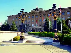 On 28 September, Artsakh president Samvel Shahramanyan signed a decree stating that all state institutions would be dissolved by 1 January 2024, bringing the existence of the republic to an end.[69] Azerbaijani President Ilham Aliyev visited the region on 15 October and officially raised the flag of Azerbaijan at the building that was previously used as the Artsakh Presidential Palace.[70] On 22 December 2023, Shahramanyan said that there was no official document stipulating the dissolution of government institutions, and his office stated that it was "empty paper".[71]
