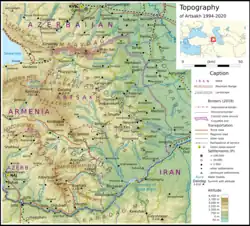 The Artsakh Republic was mountainous, a feature which has given it its former name (from the Russian for "Mountainous/Highland Karabakh"). It is 3,170 km2 (1,224 sq mi) in area.[4] The largest water body is the Sarsang Reservoir, and the major rivers are the Tartar and Khachen rivers.[72] The country is on a plateau which slopes downwards towards the east and southeast, with the average altitude being 1,100 m (3,600 ft) above sea level.[73] Most rivers in the country flow towards the Artsakh Valley.[73]