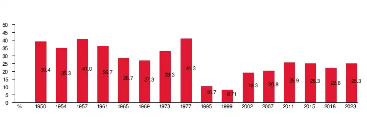 Due to the winner-take-all system in place during the 1950s, the DP achieved landslide victories in elections that were reasonably close, meaning the CHP was in opposition for 10 years. In the meantime, the party began a long transformation into a social democratic force. Even before losing power İnönü created the Ministry of Labour and signed workers protections into law, and universities were given autonomy from the state.[25] In its ninth congress in 1951, the youth branch and the women's branch were founded. In 1953, the establishment of trade unions and vocational chambers was proposed, and support for a bicameral parliament, the establishment of a constitutional court, election security, judicial independence, and the right to strike for workers was added to the party program.[28]